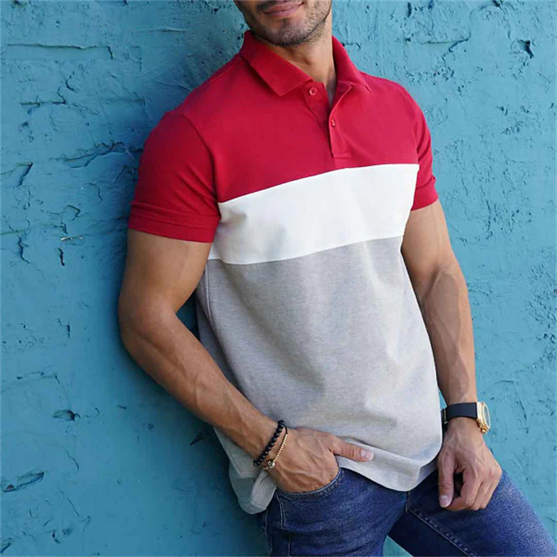Men's Shirt Patchwork Turndown Street Casual Button-Down Short Sleeve Tops Casual Fashion Breathable Comfortable White+Red
