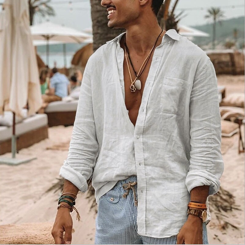 Men's Shirt Solid Color Collar Button Down Collar Street Daily Long Sleeve Tops Cotton Simple Lightweight Breathable Comfortable Green White / Washable / Henley / Vacation