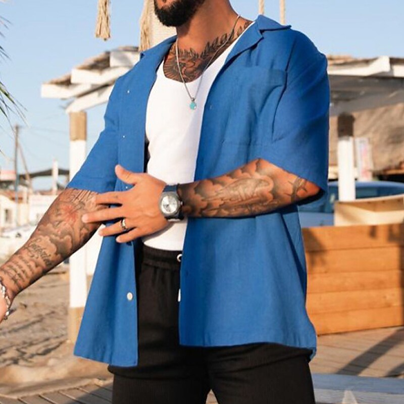 Men's Shirt Solid Color Turndown Street Daily Button-Down Short Sleeve Tops Casual Fashion Breathable Comfortable Blue