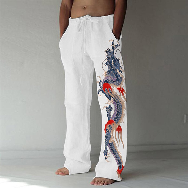 Men's Designer Fashion Straight Trousers Elastic Drawstring Design Front Pocket Print Pants Casual Daily Dragon Graphic Prints Comfort Soft Mid Waist White S M L XL XXL