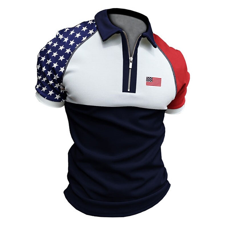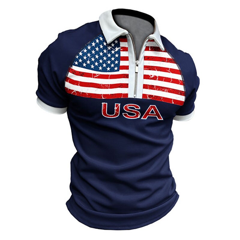 Men's Golf Shirt Flag Turndown Street Casual Zipper Short Sleeve Tops Casual Fashion Comfortable Navy Blue