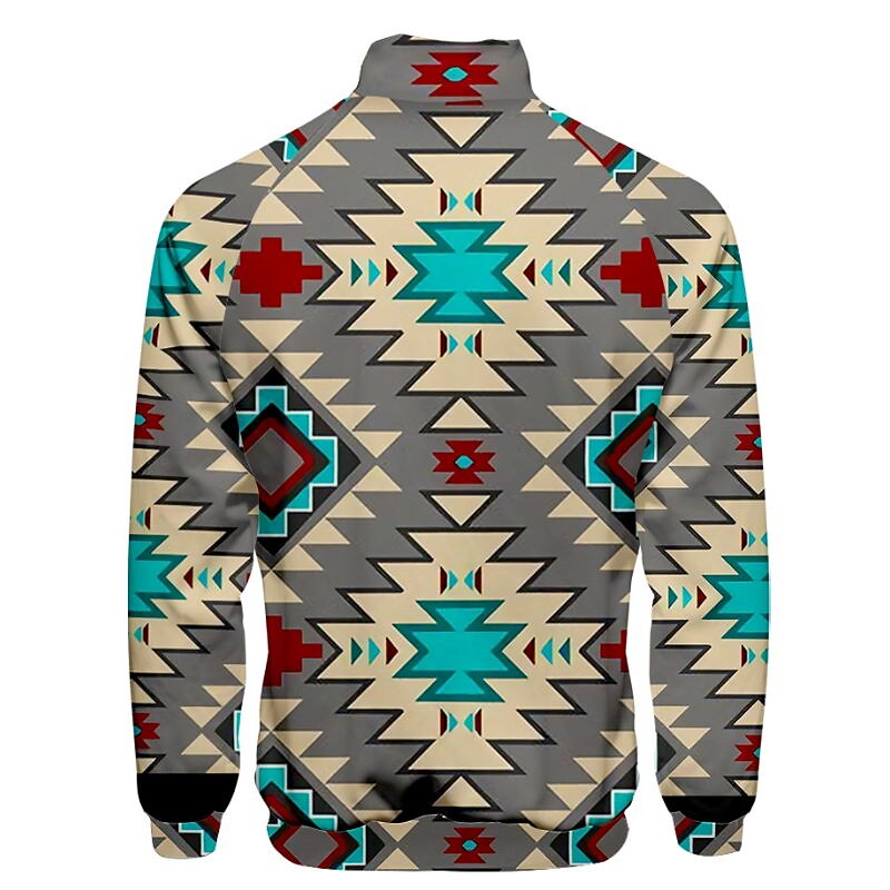 Men's T shirt Tee Graphic Patterned Standing Collar Street Daily Print Long Sleeve Tops Ethnic Style Streetwear Cool Western Aztec Gray