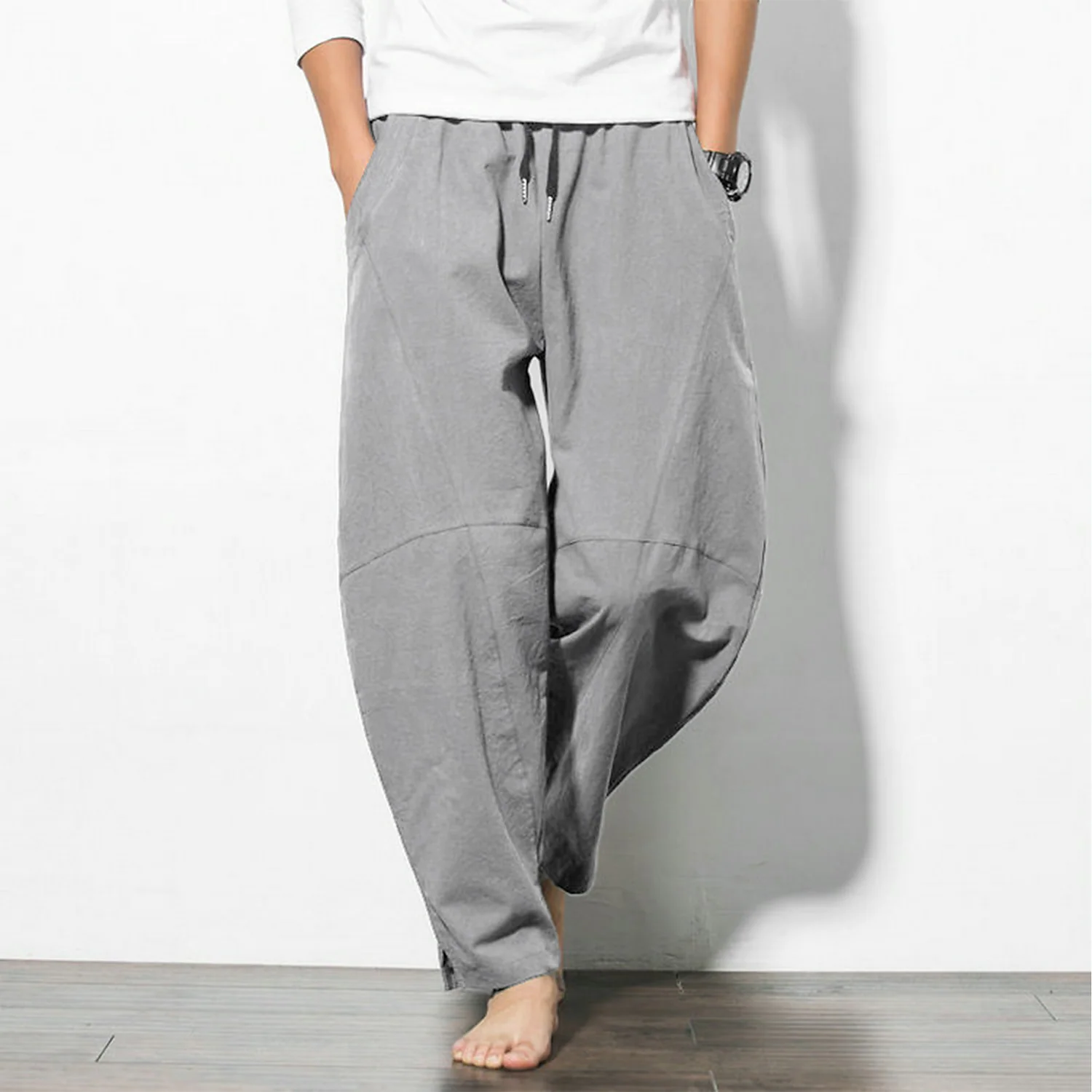 Men's Cotton Linen Trousers Casual Pants Summer Yoga Beach Pants Drawstring Loose Elastic Waist Pocket