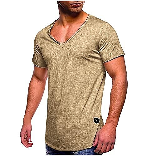 Men's Tshirt Summer Solid Color Slim Fit V-Neck Fashion Short Sleeve Top T-Shirt Beige