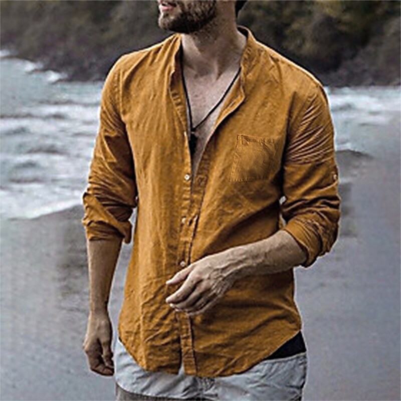 Men's Shirt Solid Colored Stand Collar Street Casual Button-Down Long Sleeve Tops Casual Fashion Breathable Comfortable Orange Summer Shirts Beach Summer Shirts