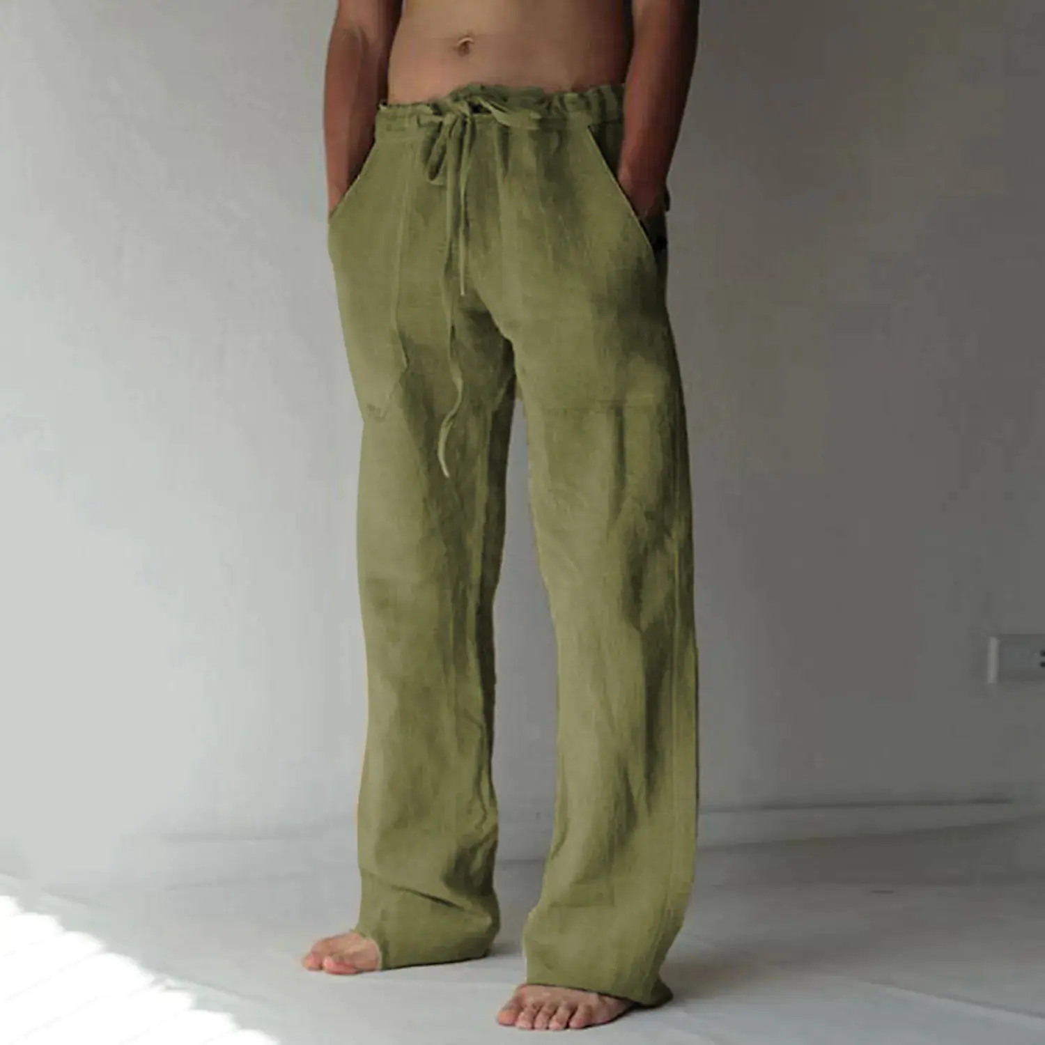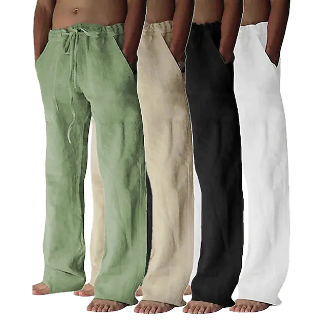 Men's Linen Casual Pants Solid Color Fashion Straight-Leg Trousers Baggy Pants With Pockets Drawstring Elastic Waist Design Beach Pants Daily Yoga Comfort Soft Mid Waist Green White Khaki 3XL