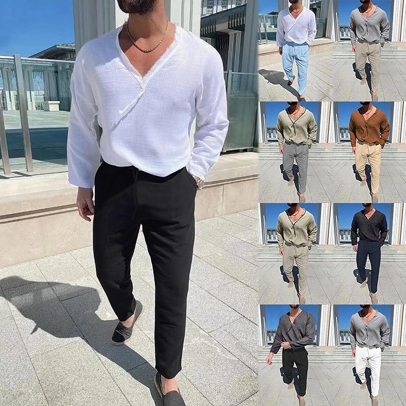 Men's Casual Straight Trousers Beach Pants Pants Solid Color Cotton Blend Mid Waist Light Blue Azure Bean Green Deep coffee White S M L XL XXL