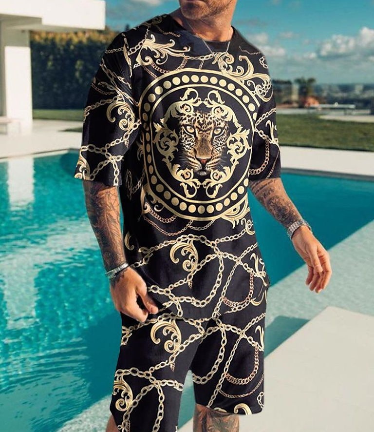 Men's Set Graphic Patterned Crew Neck Casual Vacation Tops Casual Fashion White Black Khaki