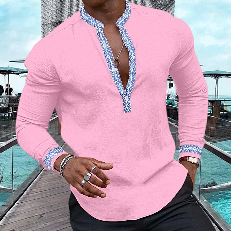 Men's Shirt Linen Shirt Summer Shirt Beach Shirt Henley Shirt White Pink Navy Blue Long Sleeve Color Block Henley Spring & Summer Casual Daily Clothing Apparel