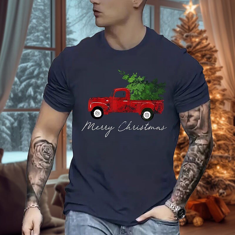 Red Truck Pick Up Christmas Tree Black White Green T shirt Tee Men's Graphic Cotton Blend Shirt Classic Shirt Short Sleeve Comfortable Tee Outdoor Holiday Summer Fashion Designer Clothing S